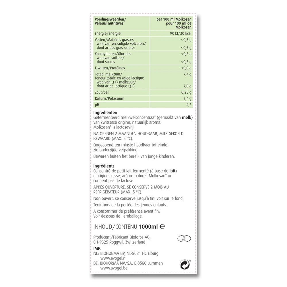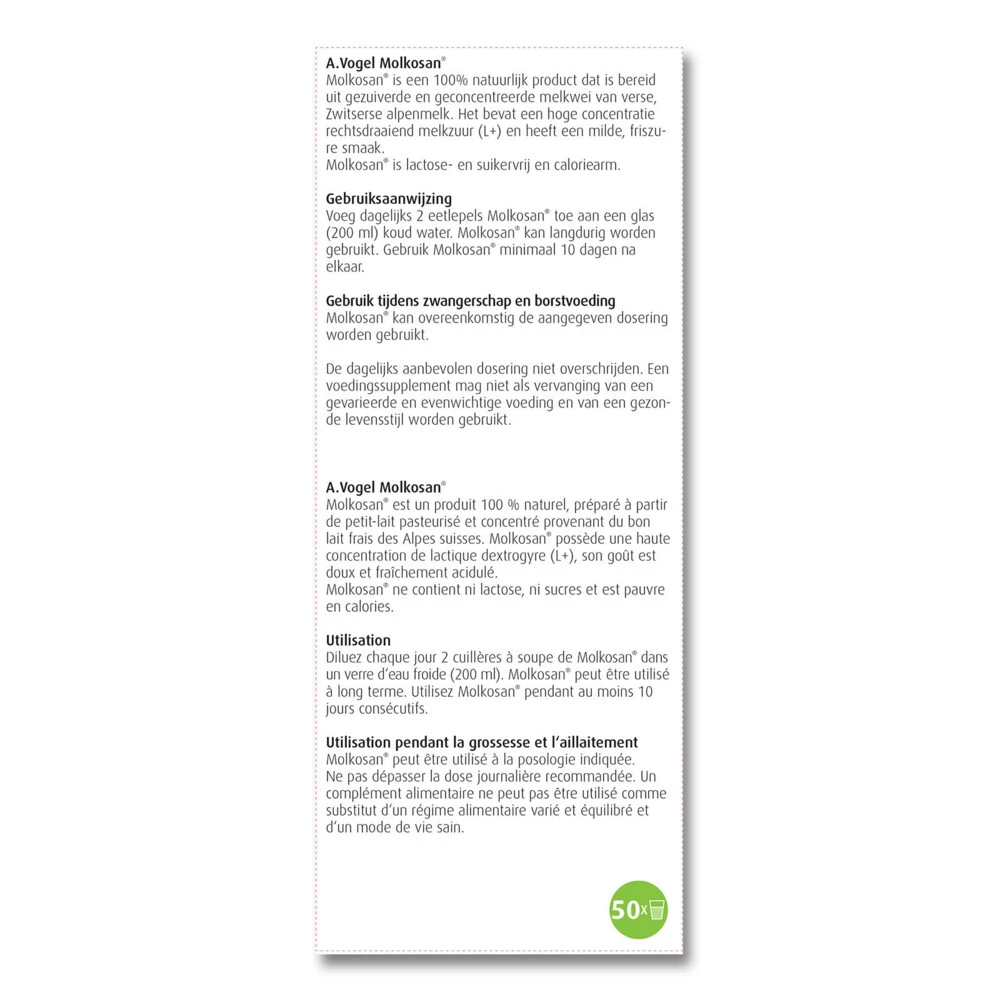 A.Vogel Molkosan A.Vogel Molkosan is een 100% natuurlijk product dat wordt gemaakt uit gezuiverde en geconcentreerde melkwei van verse Zwitserse alpenmelk. Molkosan heeft een milde, friszure smaak, is neutraal van geur en bevat een hogere concentratie rechtsdraaiend melkzuur (L+).Hoge concentratie L(+)-melkzuur (rechtsdraaiend)Molkosan is lactose- en suikervrij en caloriearmHeerlijk om te verwerken in een dressing over de saladeLekker om toe te voegen aan de mueslie
