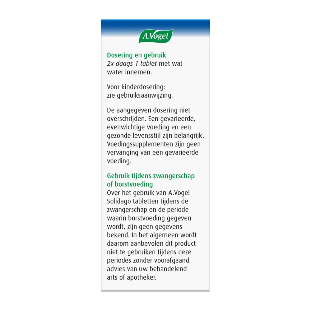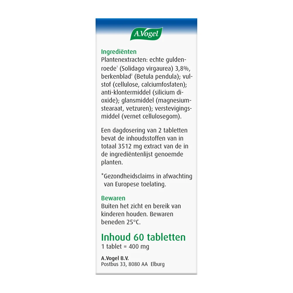 A.Vogel Solidago Goede vochthuishoudingA. Vogel SolidagoVochthuishouding1,2*Solidago Vochthuishouding1,2* tabletten van A.Vogel ondersteunt een goede nier- en blaasfunctie* en stimuleren de vochthuishouding* door de bijzondere combinatie van extracten van Solidago virgaurea en Betula pendula. Deze ingrediënten ondersteunen een goede nier- en blaasfunctie en een goede vochthuishouding*, zodat het vocht in je lichaam goed kan blijven doorstromen.Helpt bij een goede vochtbalans1,2*Ondersteunt
