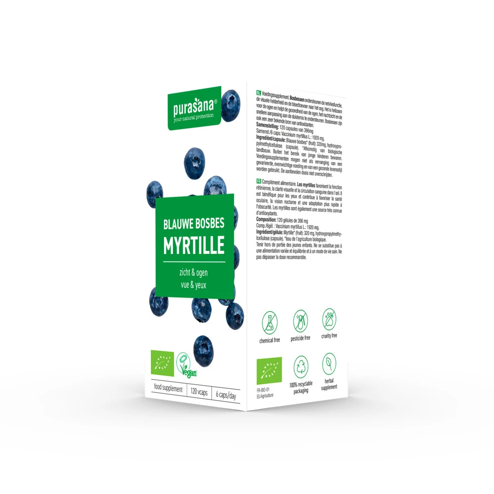 Purasana Blauwe Bosbes 320 mgPurasana Blauwe Bosbes 320 mg is een voedingssupplement op basis van blauwe bosbes. De antioxidante anthocyanosiden in blauwe bosbes helpen de juiste netvliesfuncties te behouden*. Anthocyanosiden van blauwe bosbessen kunnen ook helpen bij het stabiliseren van het gezonde collageengehalte in het oog*. Anthocyanosiden van blauwe bosbessen kunnen de gezondheid van de haarvaten en de elasticiteit van aderen helpen tegen de schadelijke effecten van vrije radicalen*.